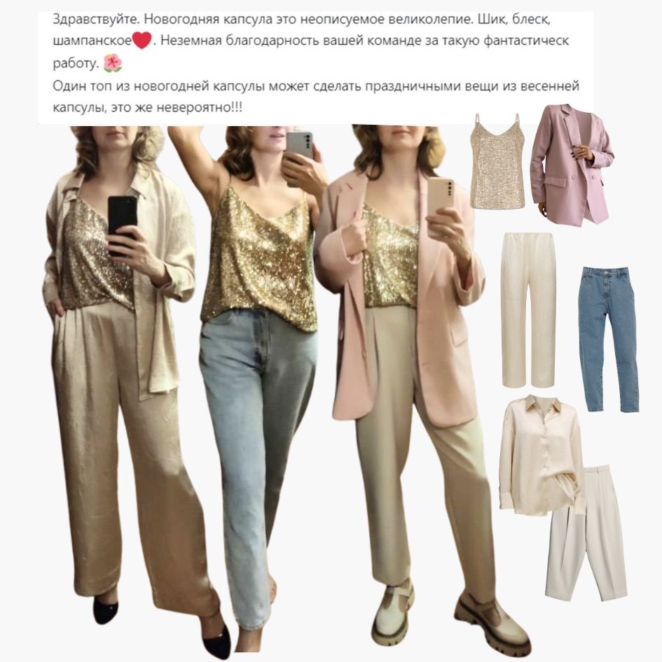 Это подбор персональной капсулы одежды, в которой все вещи сочетаются между собой и подходят под ваш образ жизни, задачи и стиль. Капсула собирается так, чтобы из минимального количества вещей вы могли составлять максимум образов.